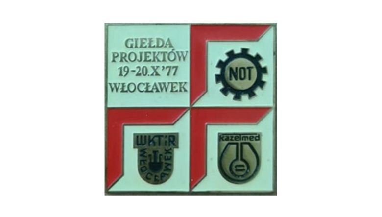 Przypinka z godłem miasta w logo Włocławskiego Klubu Techniki i Racjonalizacji, „Giełda Projektów, 19-20 października 1977 roku”.