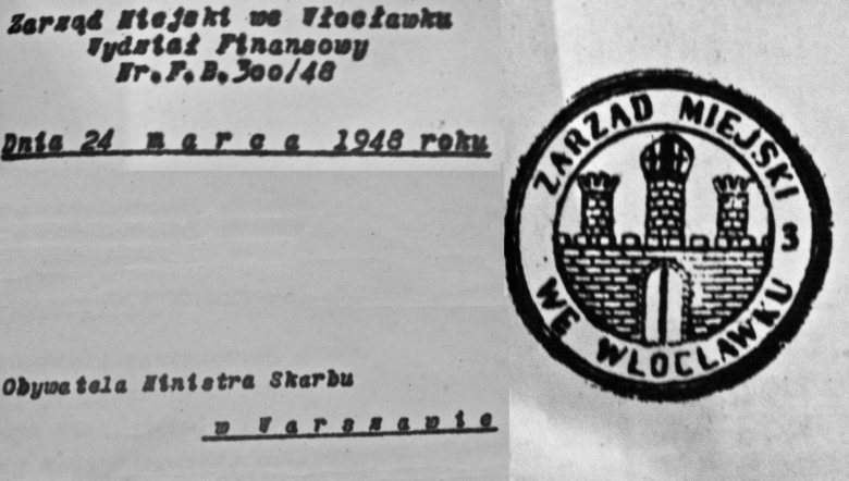 Godło na pieczęci Zarządu Miejskiego we Włocławku. Stempel na piśmie do Obywatela Ministra Skarbu w Warszawie z dnia 24 marca 1948 roku.